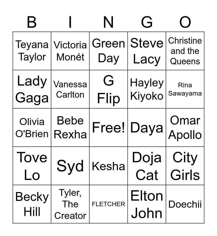 This bingo card has a free space and 71 words: Kehlani, Victoria Monét, Frank Ocean, Megan Thee Stallion, FLETCHER, Billie Eilish, Steve Lacy, Cardi B, Hayley Kiyoko, Maren Morris, Becky Hill, Troye Sivan, Rina Sawayama, Teyana Taylor, MUNA, Olivia O'Brien, Doja Cat, Christine and the Queens, Anne-Marie, Omar Apollo, Syd, Doechii, City Girls, Chappell Roan, MNEK, Janelle Monáe, Tinashe, Ashnikko, Princess Nokia, Dove Cameron, Tyler, The Creator, Reneé Rapp, Lauren Sanderson, Jessie Reyez, Elton John, Brooke Eden, Demi Lovato, Halsey, Lady Gaga, KAYTRANADA, Kesha, Sam Smith, Tove Lo, Tegan and Sara, Betty Who, Baby Tate, Lil Nas X, Vanessa Carlton, Kali Uchis, Durand Bernarr, Miley Cyrus, Lauren Jauregui, Daya, David Archuleta, Chelsea Cutler, The Aces, G Flip, Madison Beer, The Veronicas, Adam Lambert, WILLOW, Olly Alexander (Years & Years), Bebe Rexha, Rita Ora, Culture Club, 070 Shake, Green Day, Whitney Houston, Queen, David Bowie and Phoebe Bridgers.
