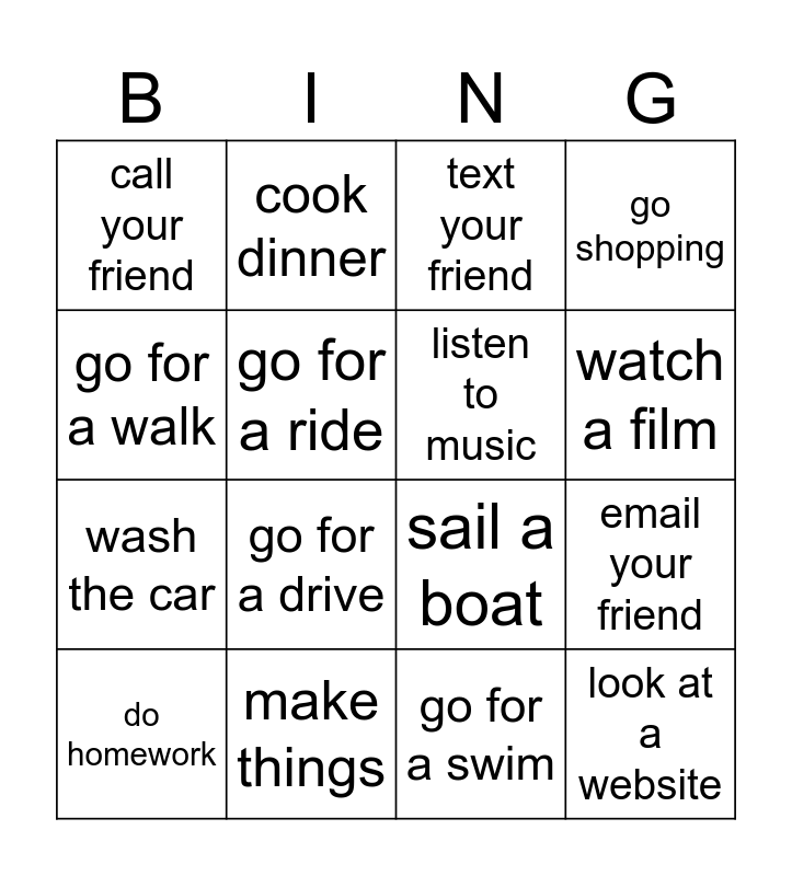 This bingo card has 16 words: make things, email your friend, text your friend, call your friend, wash the car, cook dinner, sail a boat, go for a swim, go for a walk, go for a ride, do homework, go shopping, go for a drive, watch a film, listen to music and look at a website.