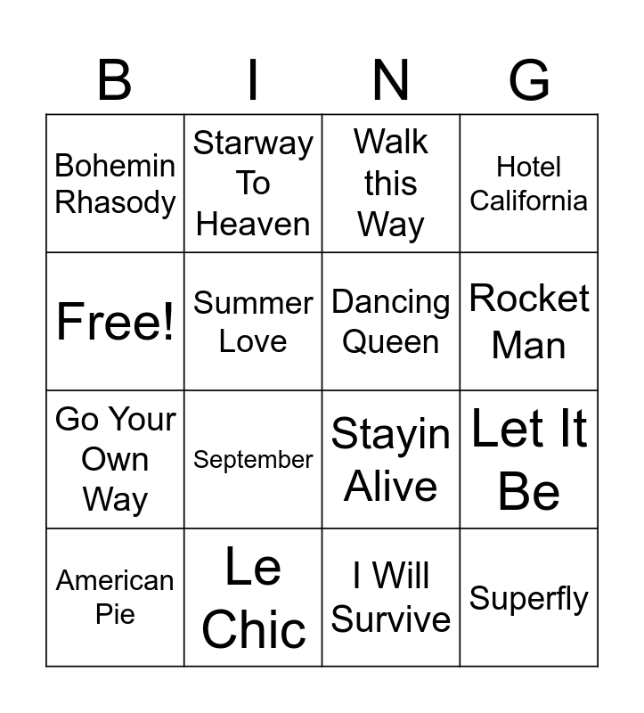 This bingo card has 16 words: Le Chic, Let It Be, Walk this Way, Bohemin Rhasody, Go Your Own Way, Starway To Heaven, Stayin Alive, I Will Survive, Free!, Summer Love, American Pie, Hotel California, September, Rocket Man, Dancing Queen and Superfly.