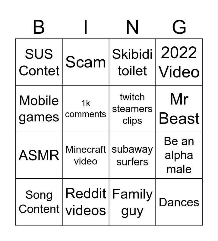 This bingo card has 16 words: Reddit videos, Be an alpha male, Skibidi toilet, SUS Contet, ASMR, Scam, subaway surfers, Family guy, Mobile games, 1k comments, Song Content, 2022 Video, Minecraft video, Mr Beast, twitch steamers clips and Dances.