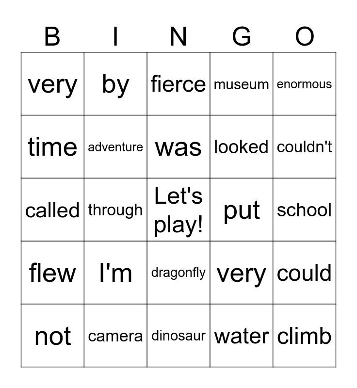 This bingo card has a free space and 24 words: I'm, camera, was, not, enormous, very, time, by, put, dragonfly, looked, called, very, could, adventure, water, school, fierce, couldn't, through, climb, flew, museum and dinosaur.