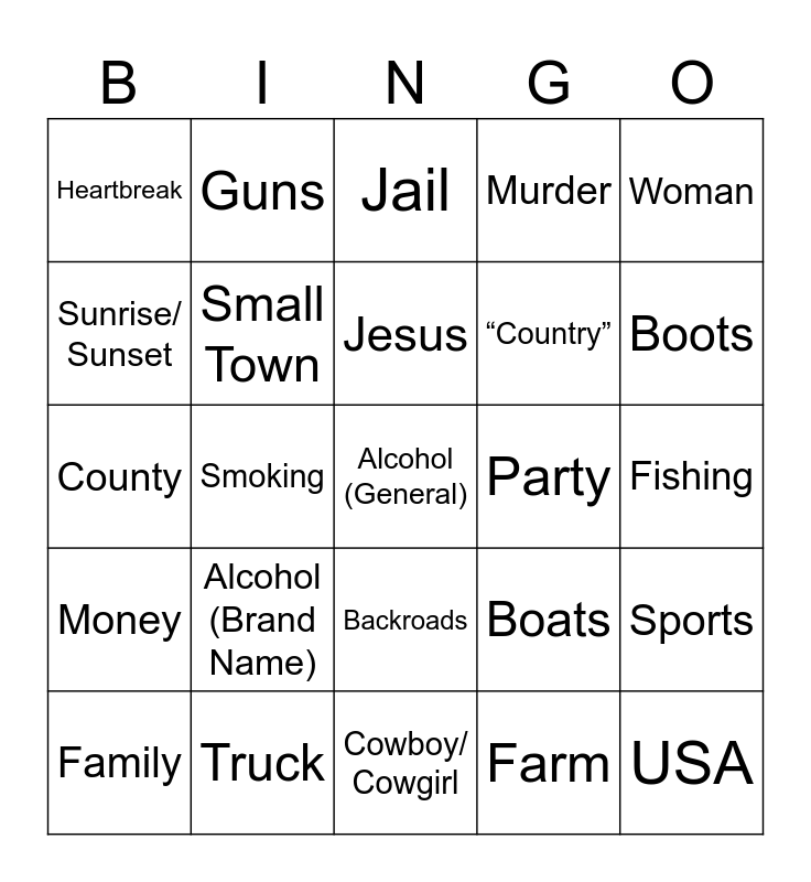 This bingo card has a free space and 24 words: Alcohol (Brand Name), Truck, Jesus, Family, Woman, Heartbreak, Sunrise/ Sunset, Guns, Party, Backroads, “Country”, County, Boats, Sports, Small Town, Farm, Fishing, Jail, Boots, Smoking, USA, Money, Murder and Cowboy/ Cowgirl.