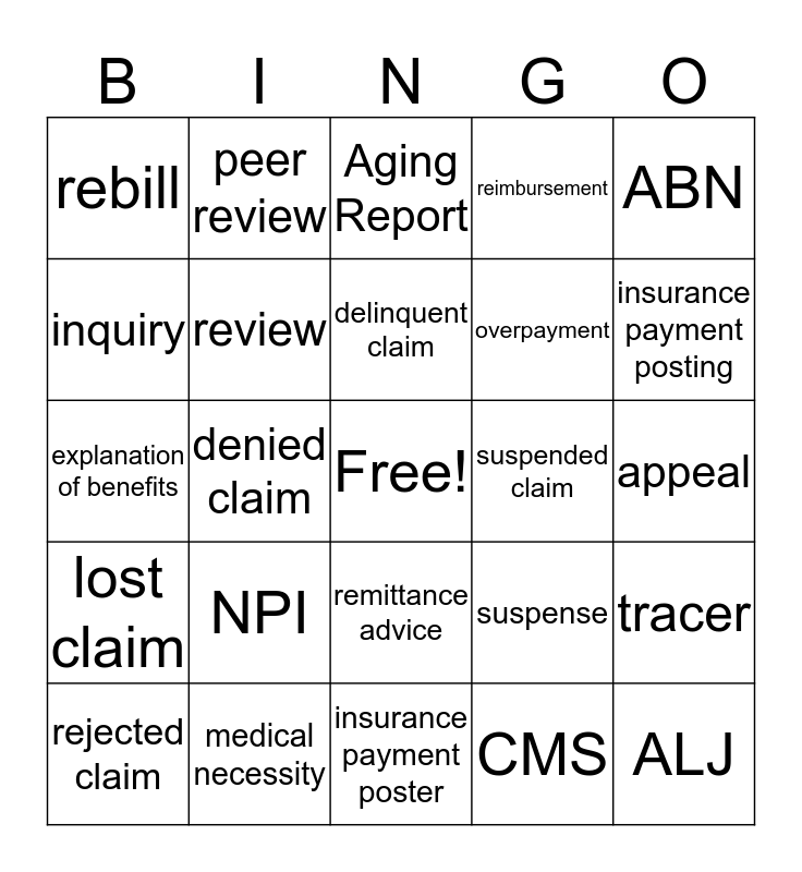 This bingo card has a free space and 24 words: NPI, medical necessity, delinquent claim, rejected claim, ABN, rebill, inquiry, peer review, suspended claim, remittance advice, overpayment, explanation of benefits, suspense, tracer, review, CMS, appeal, Aging Report, insurance payment posting, denied claim, ALJ, lost claim, reimbursement and insurance payment poster.