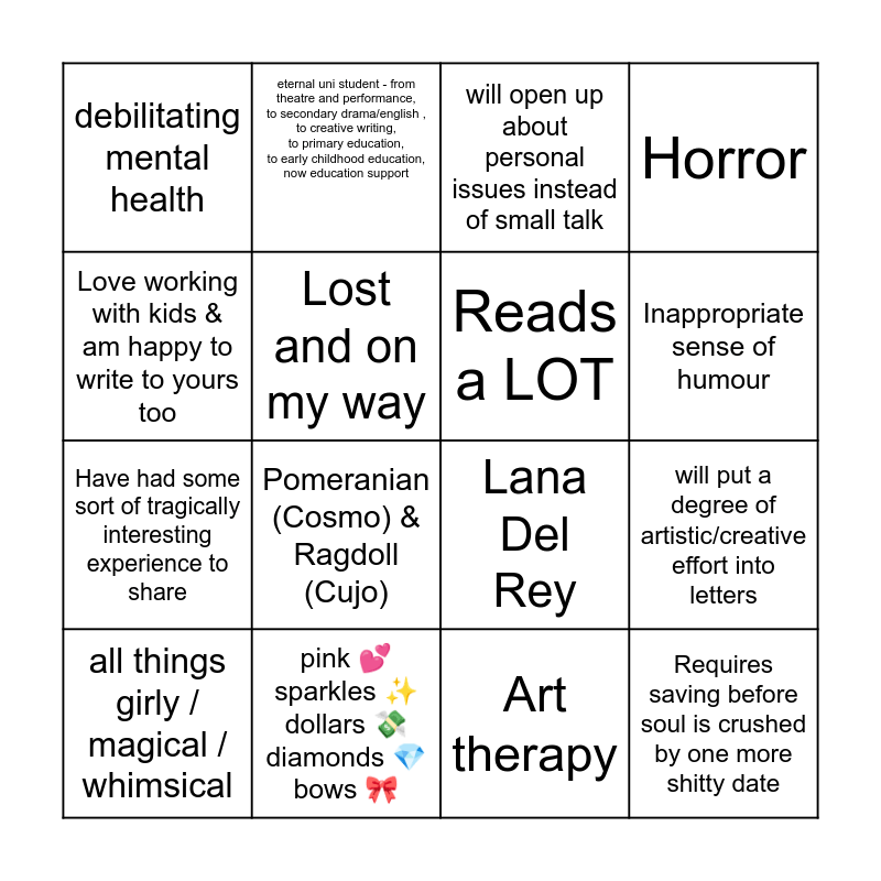This bingo card has 16 words: pink 💕 sparkles ✨ dollars 💸 diamonds 💎 bows 🎀, will put a degree of artistic/creative effort into letters, will open up about personal issues instead of small talk, debilitating mental health, Have had some sort of tragically interesting experience to share, eternal uni student - from theatre and performance, to secondary drama/english , to creative writing, to primary education, to early childhood education, now education support, Lana Del Rey, Art therapy, Love working with kids & am happy to write to yours too, Lost and on my way, all things girly / magical / whimsical, Horror, Pomeranian (Cosmo) & Ragdoll (Cujo), Inappropriate sense of humour, Reads a LOT and Requires saving before soul is crushed by one more shitty date.
