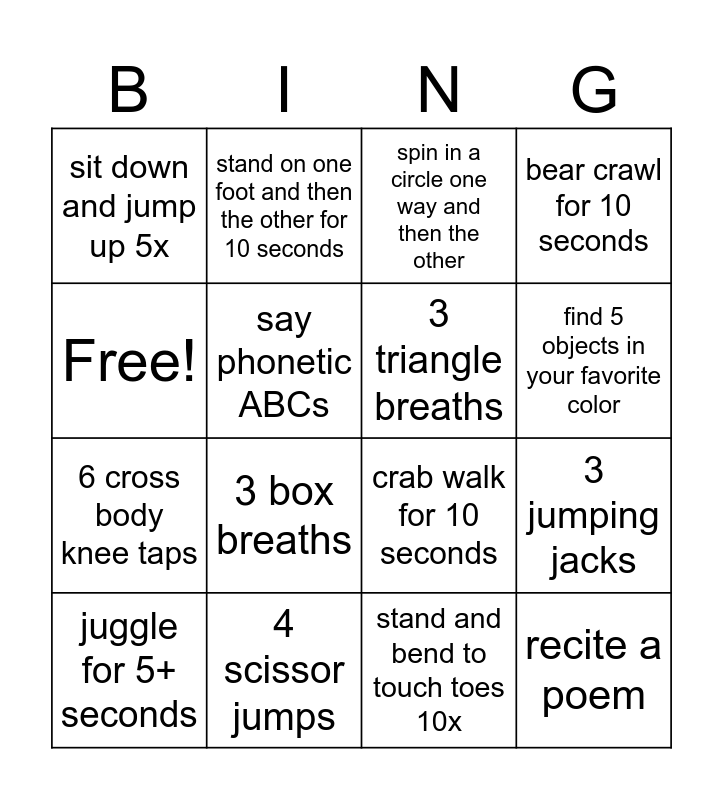 This bingo card has 16 words: 4 scissor jumps, 3 jumping jacks, spin in a circle one way and then the other, sit down and jump up 5x, 6 cross body knee taps, stand on one foot and then the other for 10 seconds, crab walk for 10 seconds, stand and bend to touch toes 10x, Free!, say phonetic ABCs, juggle for 5+ seconds, bear crawl for 10 seconds, 3 box breaths, find 5 objects in your favorite color, 3 triangle breaths and recite a poem.
