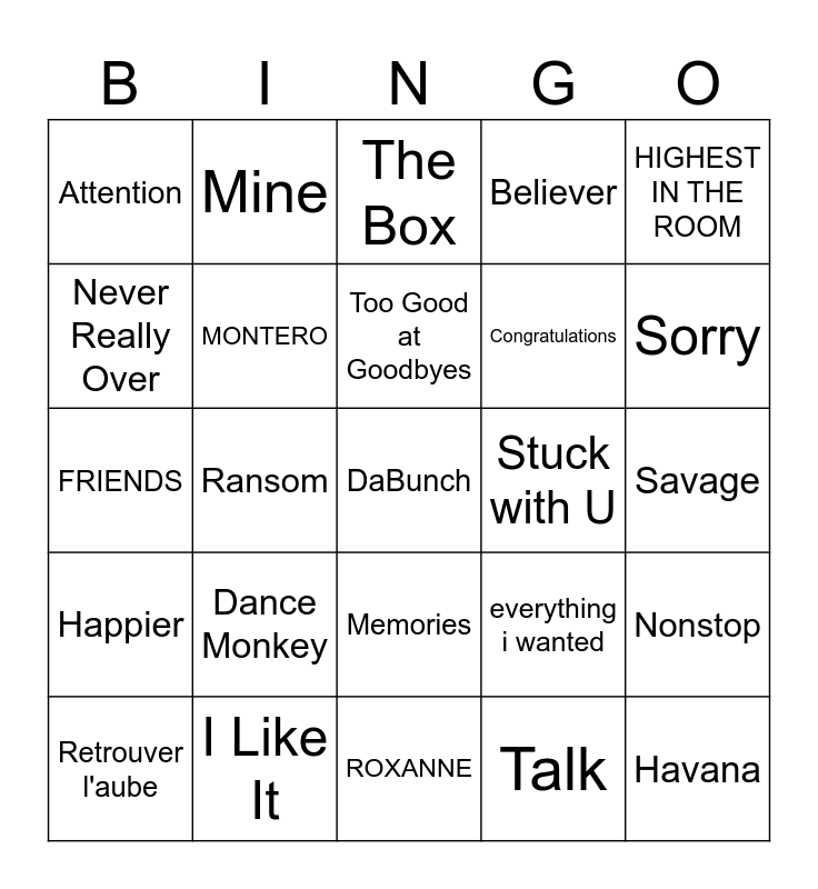 This bingo card has a free space and 106 words: Here is the list of the song titles without the numbers and artist names:, Here is the list of the song titles without any content in parentheses:, HIGHEST IN THE ROOM, Giant, Blinding Lights, Mood, Dior, Roses, Don't Start Now, SICKO MODE, Circles, ROCKSTAR, Old Town Road, Save Your Tears, Say So, God's Plan, The Box, bad guy, Watermelon Sugar, Someone You Loved, Memories, 7 rings, Shape of You, Señorita, Without Me, Dance Monkey, Sorry, Believer, I Don't Care, In My Blood, everything i wanted, Talk, Sunflower, Cheap Thrills, Taki Taki, Sucker, Truth Hurts, High Hopes, Too Good at Goodbyes, Lose You To Love Me, New Rules, In My Feelings, Sweet but Psycho, Happier, Cool, Never Really Over, CAN'T STOP THE FEELING!, Attention, Savage Love, Havana, Perfect, I Like It, Girls Like You, Better, That's What I Like, Dancing With A Stranger, Mi Gente, Goodbyes, Young Dumb & Broke, Mine, Wow., Taste, Motivation, Meant to Be, Lucid Dreams, Better Now, Eastside, Bodak Yellow, Congratulations, FRIENDS, Ransom, ROXANNE, MIDDLE CHILD, STARGAZING, when the party's over, a lot, YOSEMITE, Bandit, Life Is Good, Closer, UN DIA, BOP, Vete, DÁKITI, Dynamite, Savage Remix, Stuck with U, What You Know Bout Love, 3 Below, No Idea, Stronger, No Role Modelz, Sativa, HUMBLE., goosebumps, Nonstop, Psycho, Nice For What, Mi Gente, Savage, MONTERO, May This Be Love, Don't Let Me Down, Hungersite, Retrouver l'aube and El Mar.