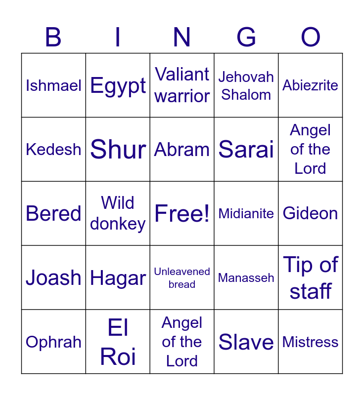 This bingo card has a free space and 24 words: Hagar, El Roi, Abram, Ophrah, Abiezrite, Ishmael, Kedesh, Egypt, Midianite, Unleavened bread, Sarai, Bered, Manasseh, Tip of staff, Shur, Slave, Gideon, Valiant warrior, Angel of the Lord, Wild donkey, Mistress, Joash, Jehovah Shalom and Angel of the Lord.