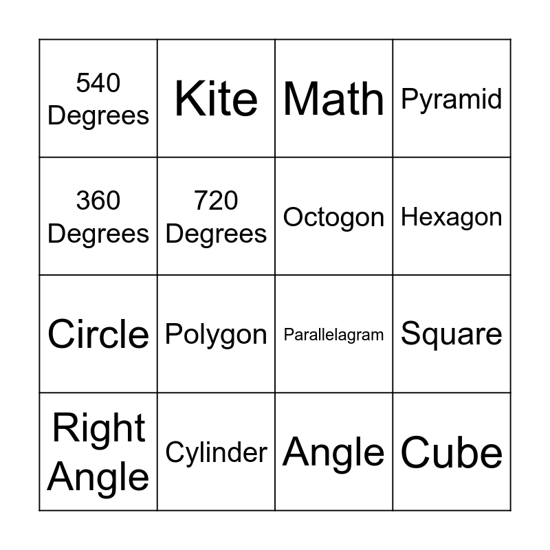This bingo card has 26 words: 180 Degrees, Quadrilateral, Hexagon, Pentagon, 360 Degrees, 540 Degrees, 720 Degrees, Kite, Angle, Trapozoid, Circle, Parallelagram, Rectangle, Rhombus, Square, Cone, Pyramid, Cube, Math, Right Angle, Polygon, Degrees, Cylinder, Rectangular Prisim, Octogon and Free Square!.
