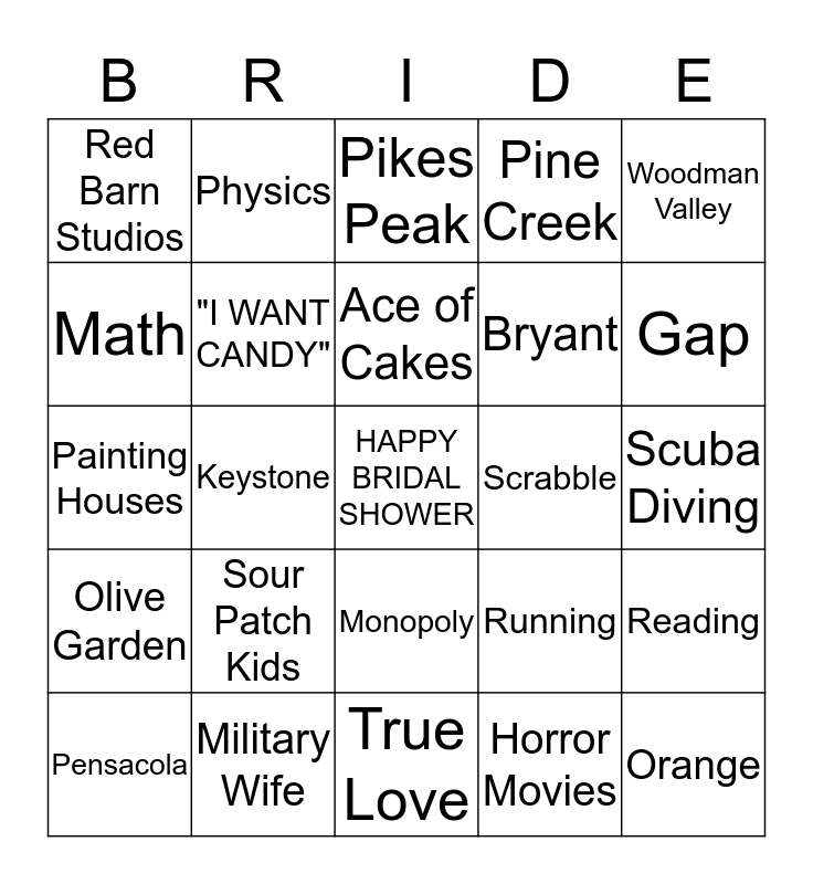 This bingo card has a free space and 24 words: Sour Patch Kids, Military Wife, Ace of Cakes, Pensacola, Woodman Valley, Red Barn Studios, Math, Physics, Scrabble, Monopoly, Bryant, Painting Houses, Running, Reading, "I WANT CANDY", Horror Movies, Scuba Diving, Pikes Peak, Gap, Keystone, Orange, Olive Garden, Pine Creek and True Love.