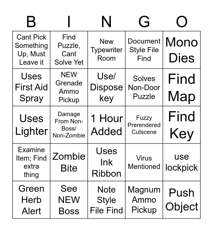 This bingo card has a free space and 24 words: Zombie Bite, See NEW Boss, Use/ Dispose key, Green Herb Alert, Mono Dies, Cant Pick Something Up, Must Leave it, Uses First Aid Spray, Find Puzzle, Cant Solve Yet, Fuzzy Prerendered Cutscene, Uses Ink Ribbon, Solves Non-Door Puzzle, Uses Lighter, Virus Mentioned, use lockpick, NEW Grenade Ammo Pickup, Magnum Ammo Pickup, Find Key, New Typewriter Room, Find Map, Damage From Non- Boss/ Non-Zombie, Push Object, Examine Item; Find extra thing, Document Style File Find and Note Style File Find.