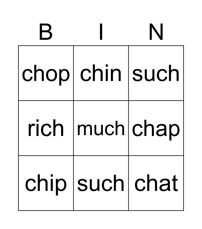 This bingo card has a free space and 9 words: chip, such, chin, rich, chop, chap, chat, chill and such.