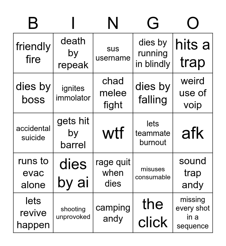 This bingo card has a free space and 24 words: dies by ai, shooting unprovoked, chad melee fight, lets revive happen, hits a trap, friendly fire, dies by boss, death by repeak, lets teammate burnout, rage quit when dies, dies by falling, accidental suicide, misuses consumable, sound trap andy, ignites immolator, the click, afk, sus username, weird use of voip, gets hit by barrel, missing every shot in a sequence, runs to evac alone, dies by running in blindly and camping andy.