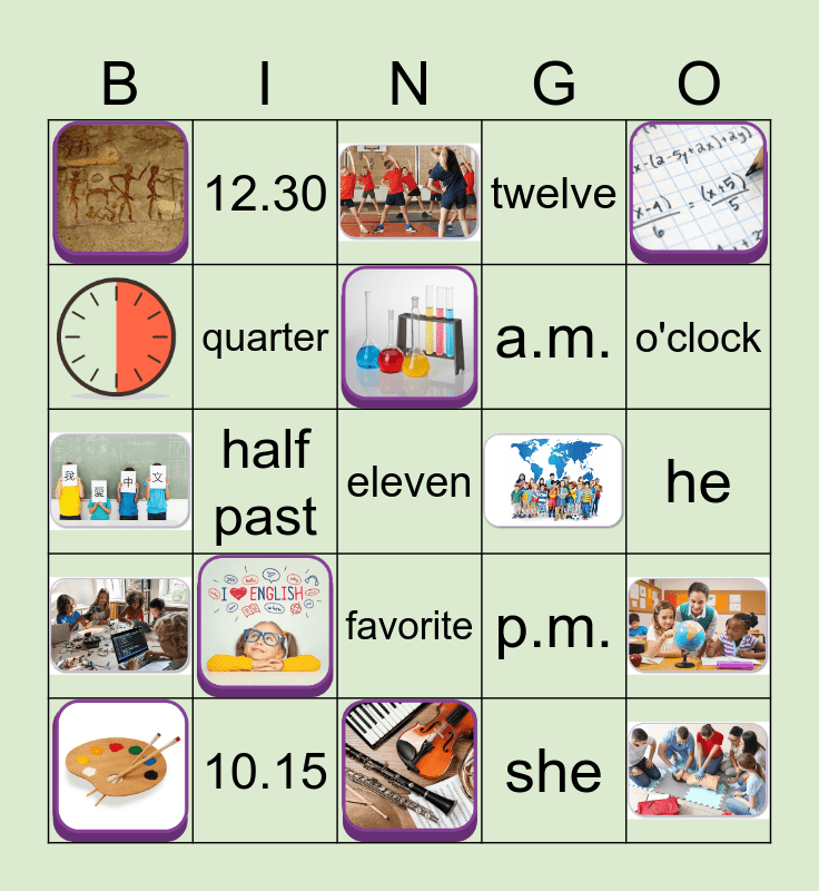 This bingo card has 13 images and 12 words: 12.30, favorite, a.m., p.m., quarter, he, o'clock, half past, eleven, 10.15, twelve and she.