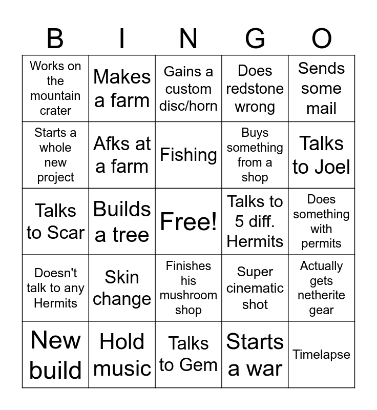 This bingo card has a free space and 24 words: Skin change, Hold music, Fishing, New build, Sends some mail, Works on the mountain crater, Starts a whole new project, Makes a farm, Talks to 5 diff. Hermits, Finishes his mushroom shop, Buys something from a shop, Talks to Scar, Super cinematic shot, Actually gets netherite gear, Afks at a farm, Starts a war, Does something with permits, Gains a custom disc/horn, Talks to Joel, Builds a tree, Timelapse, Doesn't talk to any Hermits, Does redstone wrong and Talks to Gem.