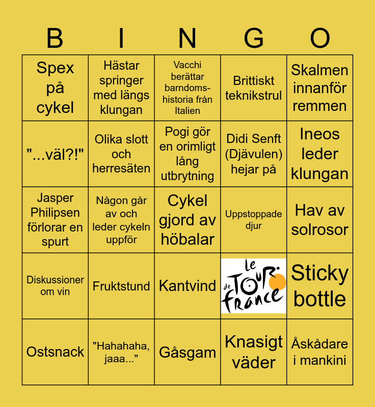 This bingo card has 1 images and 24 words: Fruktstund, Gåsgam, Pogi gör en orimligt lång utbrytning, Ostsnack, Skalmen innanför remmen, Spex på cykel, "...väl?!", Hästar springer med längs klungan, Uppstoppade djur, Kantvind, Didi Senft (Djävulen) hejar på, Jasper Philipsen förlorar en spurt, Sticky bottle, Olika slott och herresäten, Åskådare i mankini, Hav av solrosor, Vacchi berättar barndoms-historia från Italien, Ineos leder klungan, Någon går av och leder cykeln uppför, Cykel gjord av höbalar, "Hahahaha, jaaa...", Diskussioner om vin, Brittiskt teknikstrul and Knasigt väder.