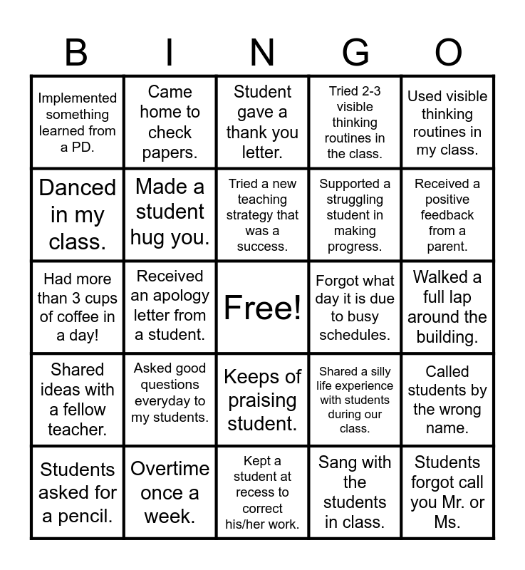 This bingo card has a free space and 24 words: Asked good questions everyday to my students., Overtime once a week., Tried a new teaching strategy that was a success., Students asked for a pencil., Used visible thinking routines in my class., Implemented something learned from a PD., Danced in my class., Came home to check papers., Forgot what day it is due to busy schedules., Keeps of praising student., Supported a struggling student in making progress., Had more than 3 cups of coffee in a day!, Shared a silly life experience with students during our class., Called students by the wrong name., Made a student hug you., Sang with the students in class., Walked a full lap around the building., Student gave a thank you letter., Received a positive feedback from a parent., Received an apology letter from a student., Students forgot call you Mr. or Ms., Shared ideas with a fellow teacher., Tried 2-3 visible thinking routines in the class. and Kept a student at recess to correct his/her work..