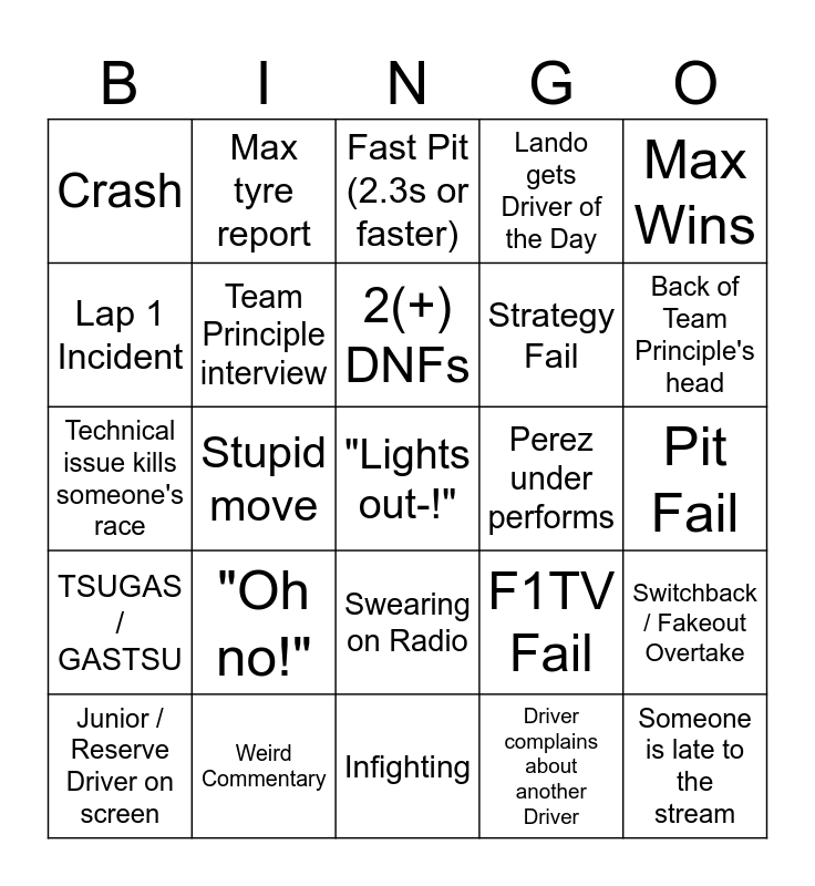 This bingo card has a free space and 24 words: "Oh no!", Weird Commentary, 2(+) DNFs, Junior / Reserve Driver on screen, Max Wins, Crash, Lap 1 Incident, Max tyre report, Perez under performs, Swearing on Radio, Strategy Fail, Technical issue kills someone's race, F1TV Fail, Switchback / Fakeout Overtake, Team Principle interview, Driver complains about another Driver, Pit Fail, Fast Pit (2.3s or faster), Back of Team Principle's head, Stupid move, Someone is late to the stream, TSUGAS / GASTSU, Lando gets Driver of the Day and Infighting.