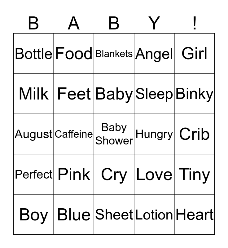 This bingo card has a free space and 24 words: Pink, Blue, Baby, Boy, Girl, Bottle, Milk, Food, Hungry, Cry, Sleep, August, Love, Tiny, Feet, Lotion, Crib, Blankets, Binky, Caffeine, Heart, Perfect, Angel and Sheet.