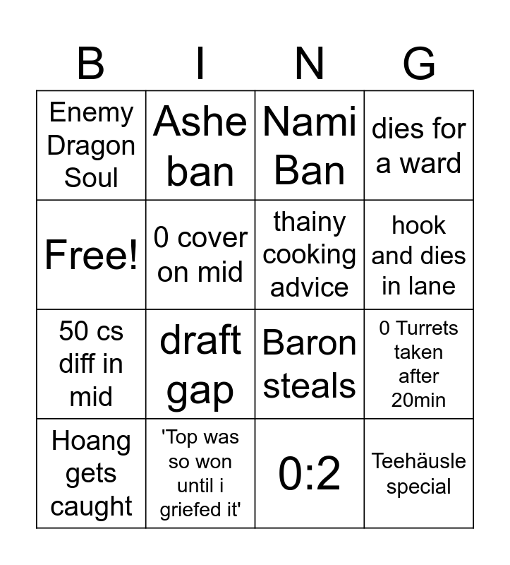 This bingo card has 16 words: 'Top was so won until i griefed it', 0 Turrets taken after 20min, Nami Ban, Enemy Dragon Soul, 50 cs diff in mid, Ashe ban, Baron steals, 0:2, Free!, 0 cover on mid, Hoang gets caught, dies for a ward, draft gap, hook and dies in lane, thainy cooking advice and Teehäusle special.