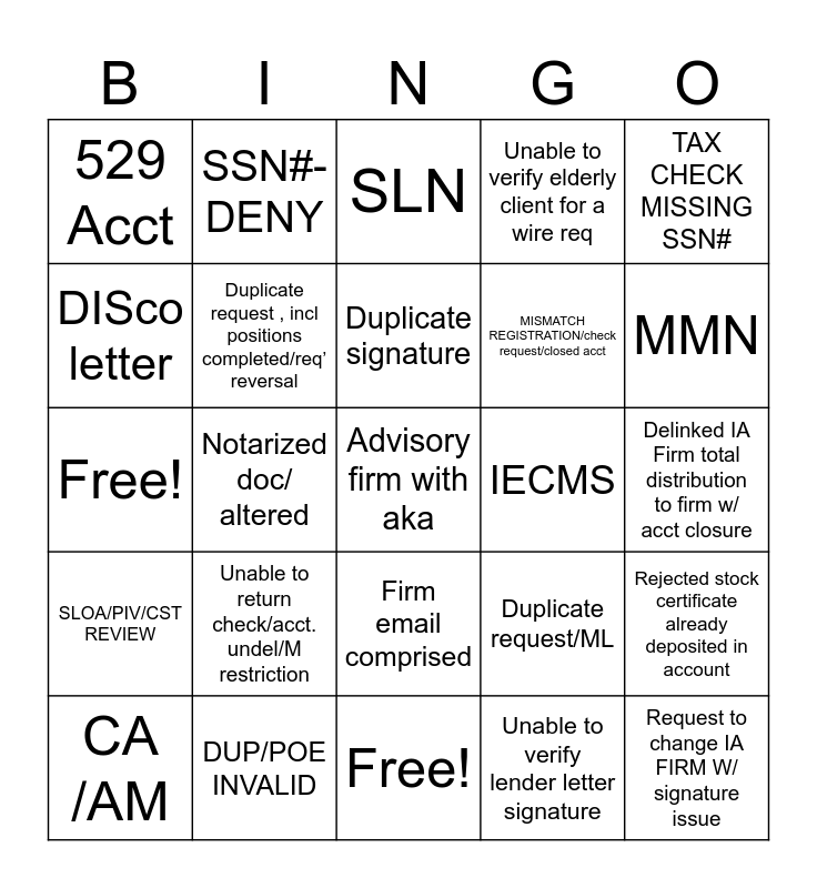 This bingo card has 25 words: SLOA/PIV/CST REVIEW, DUP/POE INVALID, Advisory firm with aka, Unable to verify lender letter signature, TAX CHECK MISSING SSN#, 529 Acct, SSN#-DENY, SLN, IECMS, Rejected stock certificate already deposited in account, DISco letter, Duplicate request , incl positions completed/req’ reversal, Free!, Duplicate request/ML, MMN, CA /AM, Notarized doc/ altered, Duplicate signature, MISMATCH REGISTRATION/check request/closed acct, Delinked IA Firm total distribution to firm w/ acct closure, Free!, Unable to return check/acct. undel/M restriction, Firm email comprised, Unable to verify elderly client for a wire req and Request to change IA FIRM W/ signature issue.