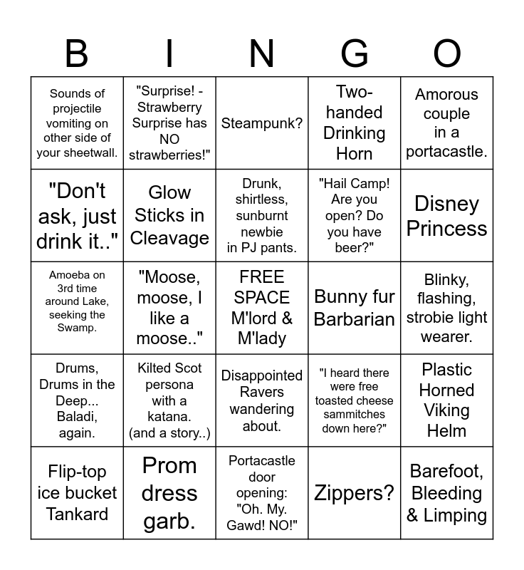 This bingo card has a free space and 24 words: Kilted Scot persona with a katana. (and a story..), Prom dress garb., Drunk, shirtless, sunburnt newbie in PJ pants., Flip-top ice bucket Tankard, Amorous couple in a portacastle., Sounds of projectile vomiting on other side of your sheetwall., "Don't ask, just drink it..", "Surprise! - Strawberry Surprise has NO strawberries!", Bunny fur Barbarian, Disappointed Ravers wandering about., "Hail Camp! Are you open? Do you have beer?", Amoeba on 3rd time around Lake, seeking the Swamp., "I heard there were free toasted cheese sammitches down here?", Plastic Horned Viking Helm, Glow Sticks in Cleavage, Zippers?, Blinky, flashing, strobie light wearer., Steampunk?, Disney Princess, "Moose, moose, I like a moose..", Barefoot, Bleeding & Limping, Drums, Drums in the Deep... Baladi, again., Two-handed Drinking Horn and Portacastle door opening: "Oh. My. Gawd! NO!".
