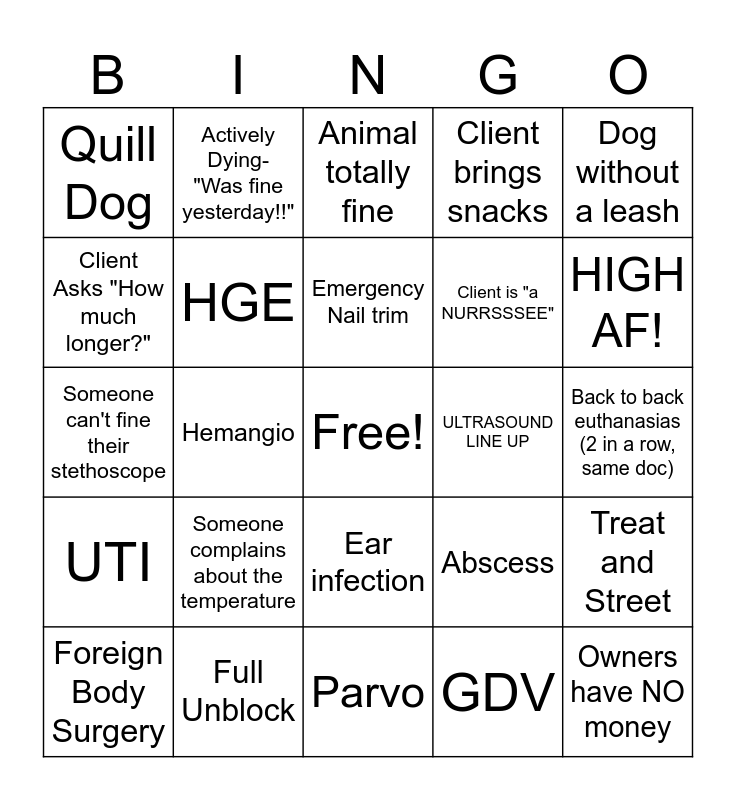 This bingo card has a free space and 24 words: Someone complains about the temperature, Full Unblock, Emergency Nail trim, Foreign Body Surgery, Dog without a leash, Quill Dog, Client Asks "How much longer?", Actively Dying- "Was fine yesterday!!", ULTRASOUND LINE UP, Ear infection, Client is "a NURRSSSEE", Someone can't fine their stethoscope, Abscess, Treat and Street, HGE, GDV, Back to back euthanasias (2 in a row, same doc), Animal totally fine, HIGH AF!, Hemangio, Owners have NO money, UTI, Client brings snacks and Parvo.