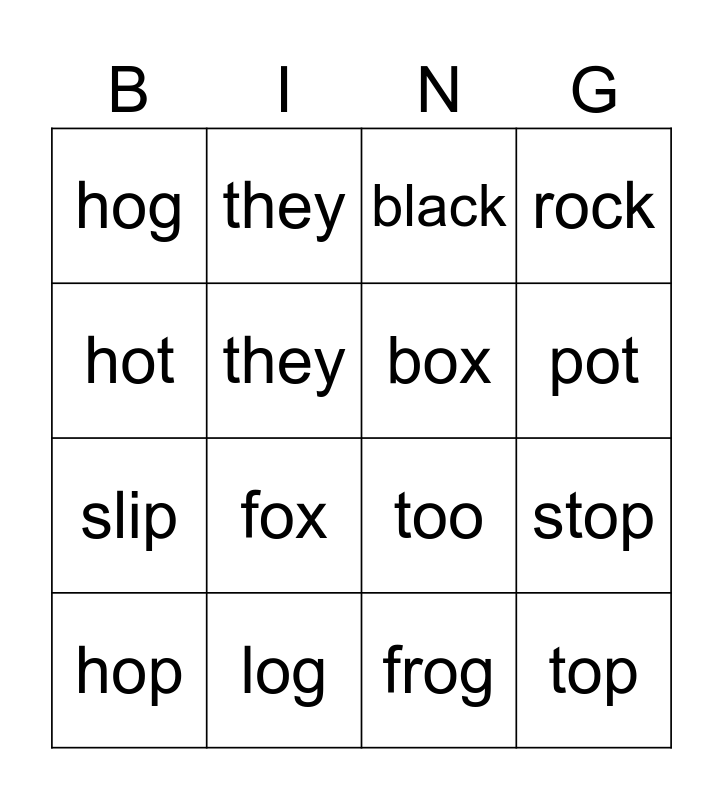 This bingo card has 16 words: log, stop, black, hog, slip, they, too, frog, hot, they, hop, rock, fox, pot, box and top.