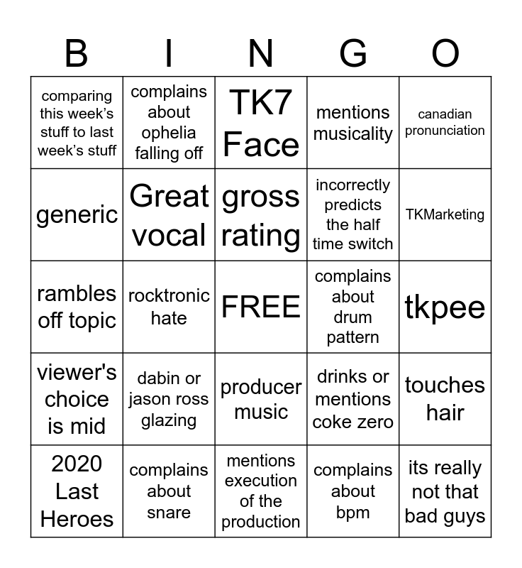This bingo card has a free space and 24 words: dabin or jason ross glazing, complains about snare, gross rating, 2020 Last Heroes, canadian pronunciation, comparing this week’s stuff to last week’s stuff, generic, complains about ophelia falling off, complains about drum pattern, producer music, incorrectly predicts the half time switch, rambles off topic, drinks or mentions coke zero, touches hair, Great vocal, complains about bpm, tkpee, TK7 Face, TKMarketing, rocktronic hate, its really not that bad guys, viewer's choice is mid, mentions musicality and mentions execution of the production.