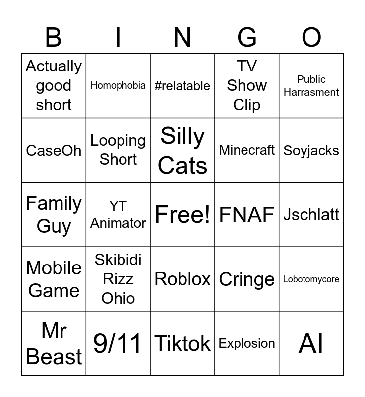 This bingo card has a free space and 25 words: Skibidi Rizz Ohio, Tiktok, Silly Cats, Mr Beast, Public Harrasment, Actually good short, CaseOh, Homophobia, FNAF, Roblox, Minecraft, Family Guy, Cringe, Lobotomycore, Looping Short, Fursuit, Jschlatt, #relatable, Soyjacks, YT Animator, AI, 9/11, Mobile Game, TV Show Clip and Explosion.