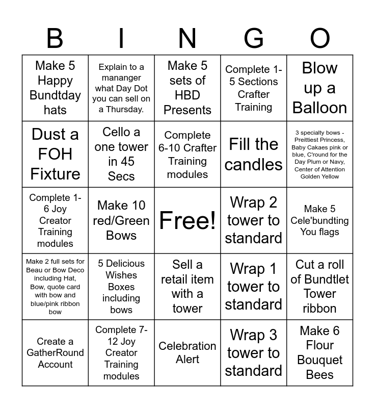 This bingo card has a free space and 31 words: Celebration Alert, Fluff a Bow in 1.5 mins, Make 10 red/Green Bows, Make a "Perfect" Prettiest Princess Hat, Make 5 Happy Bundtday hats, Make 5 sets of HBD Presents, Cello a one tower in 45 Secs, Wrap 1 tower to standard, Wrap 2 tower to standard, Wrap 3 tower to standard, Make 5 Cele'bundting You flags, Make 6 Flour Bouquet Bees, Make 2 C'Round for a day crowns - 1 plum and 1 navy, Make 3 All Star and 3 Hooray MVP flags, 3 specialty bows -Preittiest Princess, Baby Cakaes pink or blue, C'round for the Day Plum or Navy, Center of Attention Golden Yellow, Make 4 serving packages - 2 small & 2 large, Cut a roll of Bundtlet Tower ribbon, 5 Delicious Wishes Boxes including bows, Make 2 full sets for Beau or Bow Deco including Hat, Bow, quote card with bow and blue/pink ribbon bow, Sell a retail item with a tower, Blow up a Balloon, Each Shift give away 1 free Bundtlet to "Surprise and Delight" a Guest that you connect with!, Create a GatherRound Account, Explain to a mananger what Day Dot you can sell on a Thursday., Fill the candles, Dust a FOH Fixture, Complete 1-5 Sections Crafter Training, Complete 1-6 Joy Creator Training modules, Complete 7-12 Joy Creator Training modules, Complete 6-10 Crafter Training modules and Know what the Sweet Steps of Service are and explain to a manger..