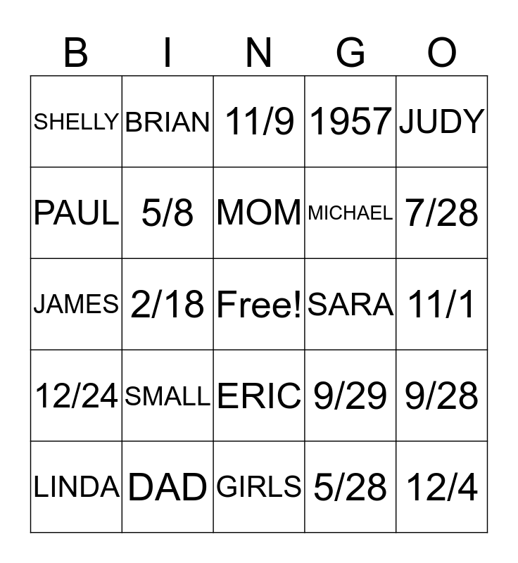 This bingo card has a free space and 24 words: SMALL, DAD, MOM, LINDA, JUDY, SHELLY, PAUL, BRIAN, SARA, ERIC, MICHAEL, JAMES, 9/29, 9/28, 5/8, 5/28, 11/1, 11/9, 7/28, 2/18, 12/4, 12/24, 1957 and GIRLS.