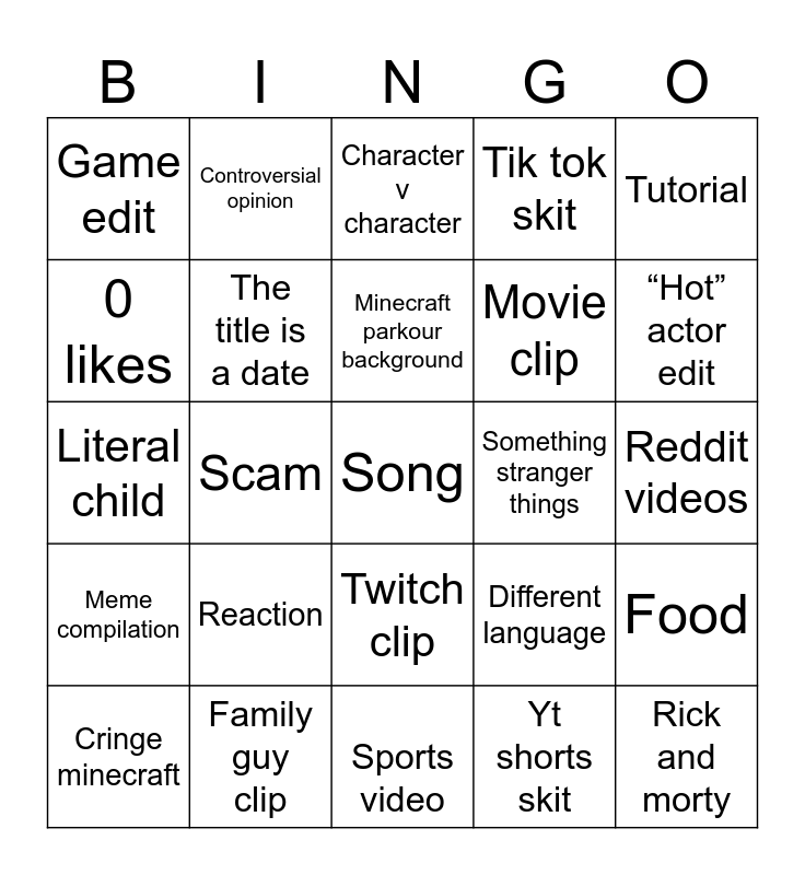 This bingo card has 25 words: Reaction, Sports video, Minecraft parkour background, Cringe minecraft, Tutorial, Game edit, 0 likes, Controversial opinion, Something stranger things, Twitch clip, Movie clip, Literal child, Different language, Food, The title is a date, Rick and morty, Reddit videos, Character v character, “Hot” actor edit, Scam, Song, Family guy clip, Meme compilation, Tik tok skit and Yt shorts skit.