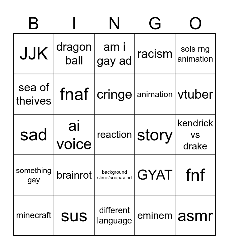 This bingo card has a free space and 24 words: brainrot, sus, cringe, minecraft, sols rng animation, JJK, sea of theives, dragon ball, story, background slime/soap/sand, animation, sad, GYAT, fnf, fnaf, eminem, kendrick vs drake, am i gay ad, vtuber, ai voice, asmr, something gay, racism and different language.