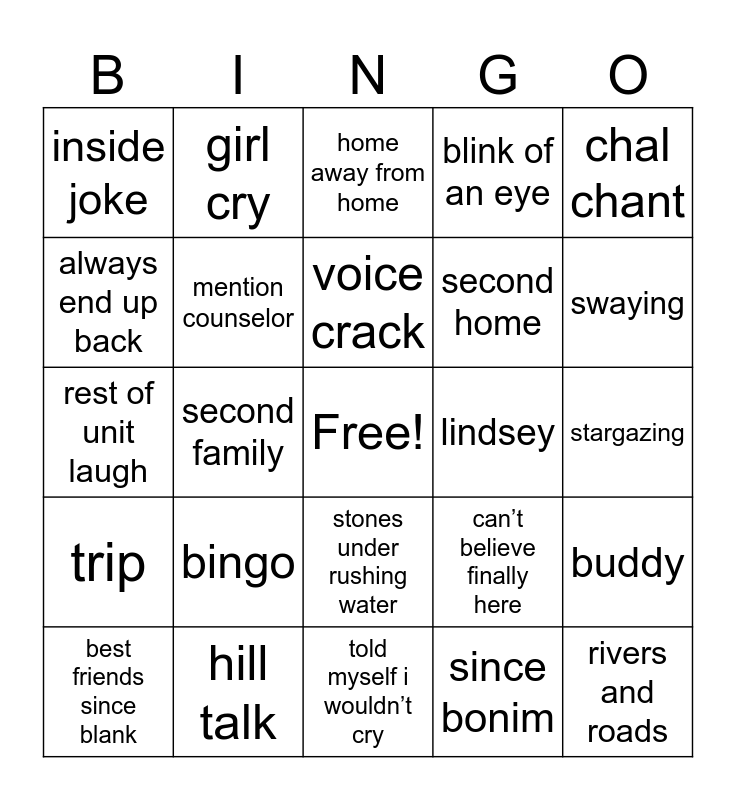 This bingo card has a free space and 24 words: bingo, hill talk, voice crack, best friends since blank, chal chant, inside joke, always end up back, girl cry, lindsey, stones under rushing water, second home, rest of unit laugh, can’t believe finally here, buddy, mention counselor, since bonim, stargazing, home away from home, swaying, second family, rivers and roads, trip, blink of an eye and told myself i wouldn’t cry.