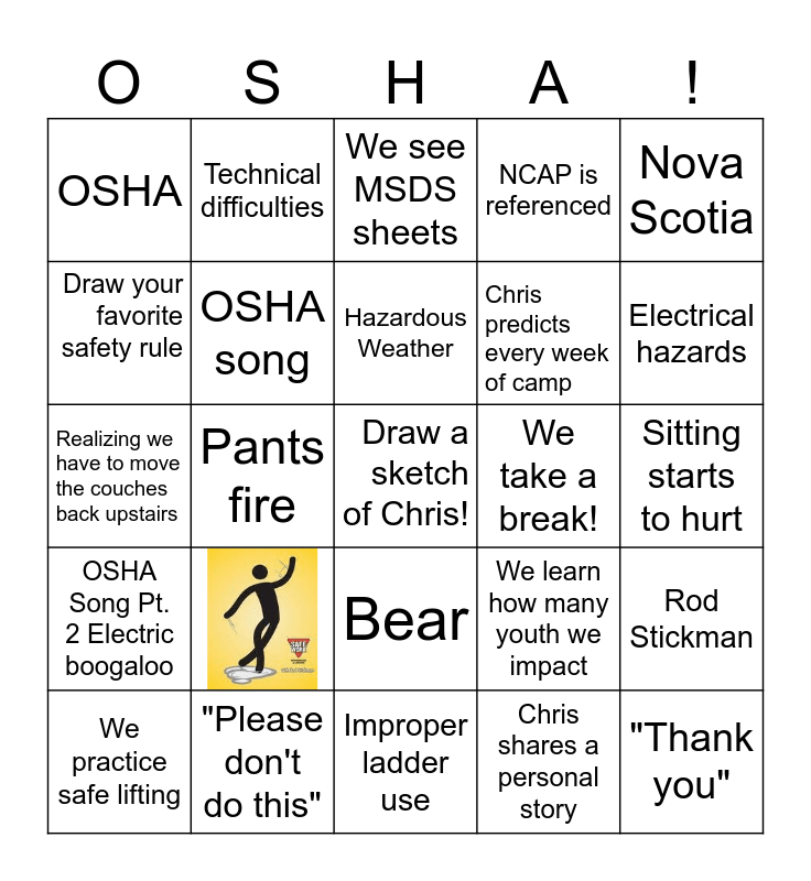 This bingo card has 1 images, a free space and 23 words: "Please don't do this", Hazardous Weather, We practice safe lifting, Nova Scotia, OSHA, Draw your favorite safety rule, Technical difficulties, We take a break!, Bear, Chris predicts every week of camp, Realizing we have to move the couches back upstairs, We learn how many youth we impact, Rod Stickman, OSHA song, Chris shares a personal story, Sitting starts to hurt, We see MSDS sheets, Electrical hazards, Pants fire, "Thank you", OSHA Song Pt. 2 Electric boogaloo, NCAP is referenced and Improper ladder use.