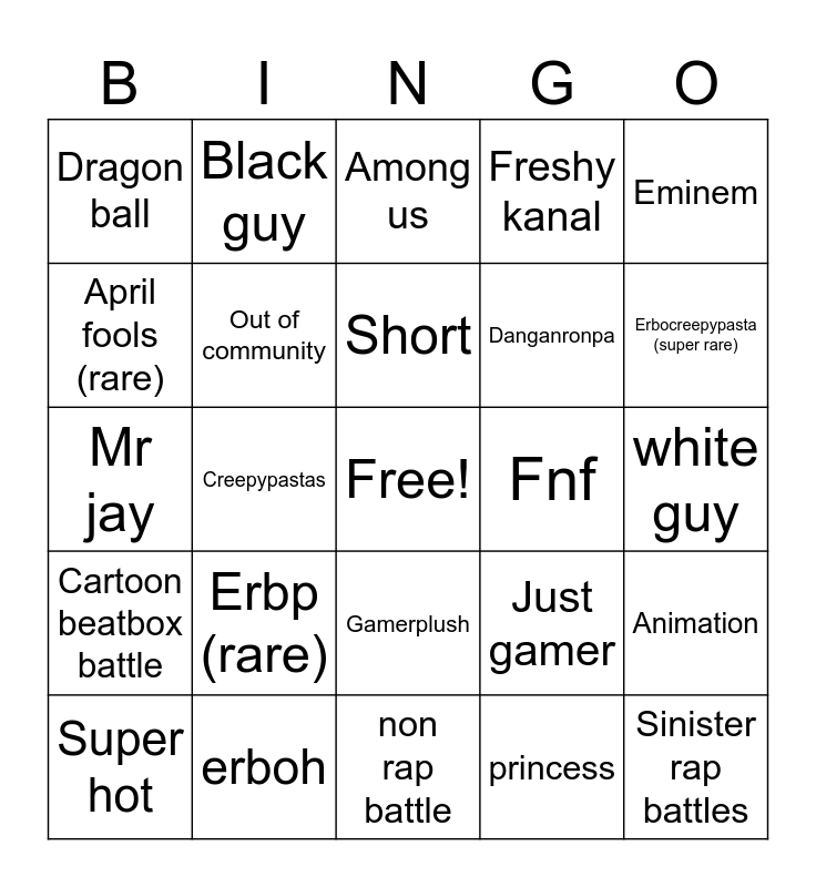 This bingo card has a free space and 24 words: Erbp (rare), erboh, Short, Super hot, Eminem, Dragon ball, April fools (rare), Black guy, Fnf, Gamerplush, Danganronpa, Mr jay, Just gamer, Animation, Out of community, princess, white guy, Among us, Erbocreepypasta (super rare), Creepypastas, Sinister rap battles, Cartoon beatbox battle, Freshy kanal and non rap battle.