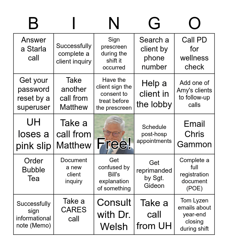 This bingo card has a free space and 29 words: Successfully sign informational note (Memo), Take a call from Millis, Take a call from Matthew, Realize EPAT already completed a screen before UH asked us, Answer a Starla call, Sign prescreen during the shift it occurred, Take another call from Matthew, Document a new client inquiry, Schedule post-hosp appointments, Take a CARES call, Email Chris Gammon, Tom Lyzen emails about year-end closing during shift, Consult with Dr. Welsh, Take a call from UH, Add one of Amy's clients to follow-up calls, Take another call from Starla, Get confused by Bill's explanation of something, Order Bubble Tea, Call PD for wellness check, UH loses a pink slip, Get reprimanded by Sgt. Gideon, Ryan hangs up on you, Help a client in the lobby, Get your password reset by a superuser, Search a client by phone number, Successfully complete a client inquiry, Complete a full registration document (POE), Have the client sign the consent to treat before the prescreen and Talk to Diana Clark.