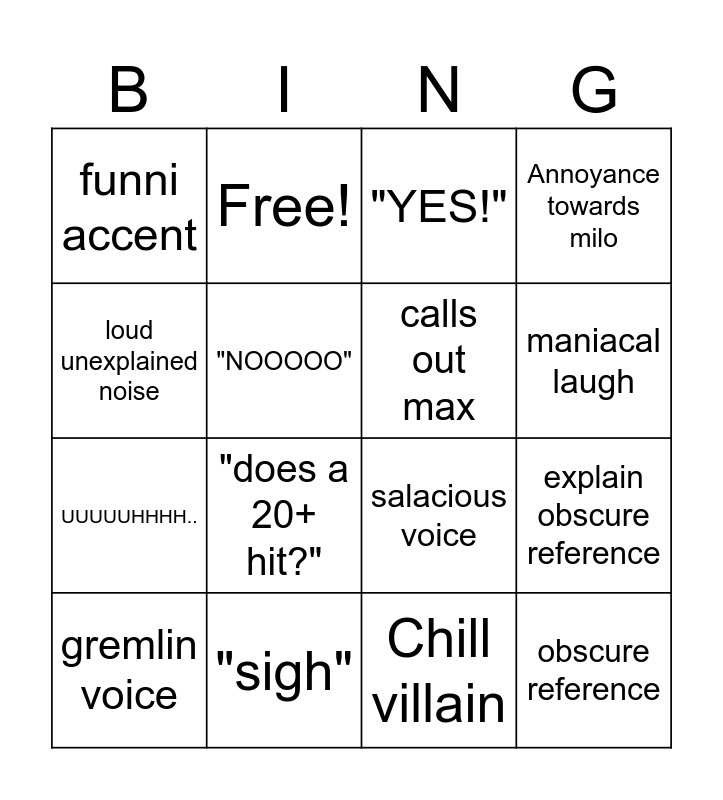 This bingo card has 19 words: salacious voice, "let me be clear", "YES!", obscure reference, explain obscure reference, loud unexplained noise, Chill villain, funni accent, Free!, UUUUUHHHH.., "does a 20+ hit?", "NOOOOO", calls out max, "sigh", gremlin voice, "pause", Annoyance towards milo, maniacal laugh and "what was that?".