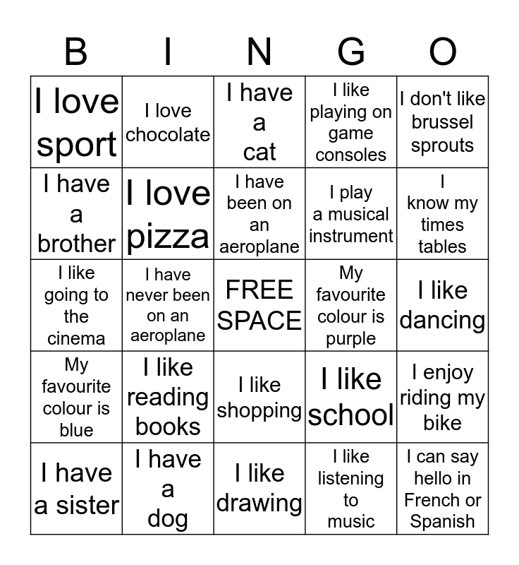 This bingo card has a free space and 24 words: I like reading books, I have a dog, I have been on an aeroplane, I have a sister, I don't like brussel sprouts, I love sport, I have a brother, I love chocolate, My favourite colour is purple, I like shopping, I play a musical instrument, I like going to the cinema, I like school, I enjoy riding my bike, I love pizza, I like listening to music, I like dancing, I have a cat, I know my times tables, I have never been on an aeroplane, I can say hello in French or Spanish, My favourite colour is blue, I like playing on game consoles and I like drawing.