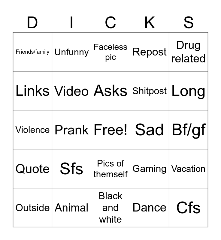 This bingo card has a free space and 24 words: Sfs, Animal, Asks, Outside, Drug related, Friends/family, Links, Unfunny, Sad, Pics of themself, Shitpost, Violence, Gaming, Vacation, Video, Dance, Bf/gf, Faceless pic, Long, Prank, Cfs, Quote, Repost and Black and white.