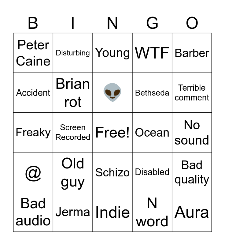 This bingo card has a free space and 24 words: Old guy, Jerma, 👽, Bad audio, Barber, Peter Caine, Accident, Disturbing, Ocean, Schizo, Bethseda, Freaky, Disabled, Bad quality, Brian rot, N word, No sound, Young, Terrible comment, Screen Recorded, Aura, @, WTF and Indie.
