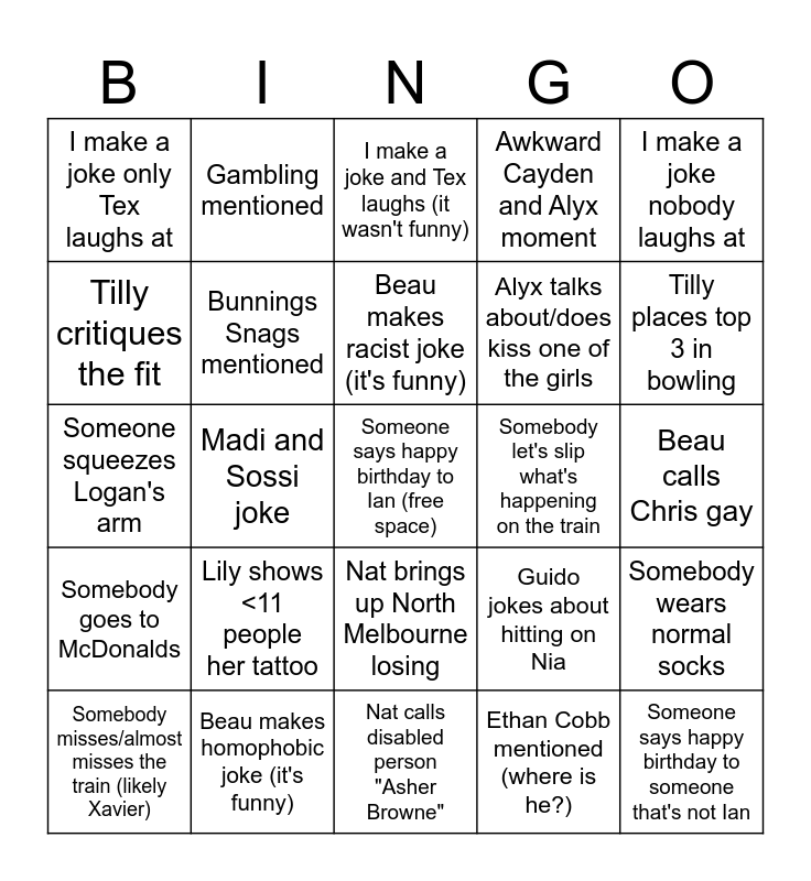 This bingo card has a free space and 24 words: Lily shows <11 people her tattoo, Beau makes homophobic joke (it's funny), Beau makes racist joke (it's funny), Somebody misses/almost misses the train (likely Xavier), I make a joke nobody laughs at, I make a joke only Tex laughs at, Tilly critiques the fit, Gambling mentioned, Somebody let's slip what's happening on the train, Nat brings up North Melbourne losing, Alyx talks about/does kiss one of the girls, Someone squeezes Logan's arm, Guido jokes about hitting on Nia, Somebody wears normal socks, Bunnings Snags mentioned, Ethan Cobb mentioned (where is he?), Beau calls Chris gay, I make a joke and Tex laughs (it wasn't funny), Tilly places top 3 in bowling, Madi and Sossi joke, Someone says happy birthday to someone that's not Ian, Somebody goes to McDonalds, Awkward Cayden and Alyx moment and Nat calls disabled person "Asher Browne".