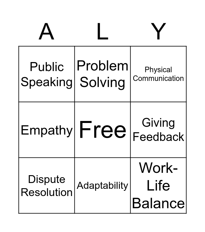 This bingo card has a free space and 8 words: Giving Feedback, Physical Communication, Problem Solving, Dispute Resolution, Public Speaking, Work-Life Balance, Empathy and Adaptability.