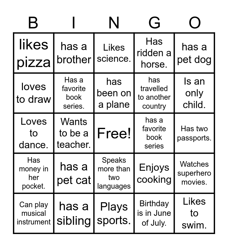 This bingo card has a free space and 24 words: has a pet cat, has a sibling, has been on a plane, Can play musical instrument, has a pet dog, likes pizza, loves to draw, has a brother, has a favorite book series, Speaks more than two languages, has travelled to another country, Loves to dance., Enjoys cooking, Watches superhero movies., Has a favorite book series., Birthday is in June of July., Has two passports., Likes science., Is an only child., Wants to be a teacher., Likes to swim., Has money in her pocket., Has ridden a horse. and Plays sports..