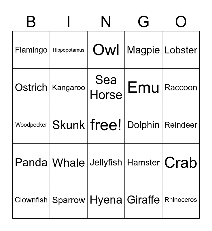 This bingo card has a free space and 32 words: Giraffe, Squirrel, Skunk, Dinosaur, Panda, Kangaroo, Lobster, Crab, Hippopotamus, Walrus, Sea Horse, Owl, Sloth, Penguin, Dolphin, Shark, Clownfish, Woodpecker, Jellyfish, Whale, Hamster, Peacock, Reindeer, Sparrow, Rhinoceros, Magpie, Emu, Ostrich, Flamingo, Hyena, Pelican and Raccoon.