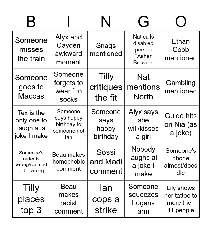 This bingo card has a free space and 24 words: Beau makes homophobic comment, Beau makes racist comment, Tilly critiques the fit, Tilly places top 3, Ethan Cobb mentioned, Someone misses the train, Someone goes to Maccas, Alyx and Cayden awkward moment, Alyx says she will/kisses a girl, Sossi and Madi comment, Nat mentions North, Tex is the only one to laugh at a joke I make, Nobody laughs at a joke I make, Someone's phone almost/does die, Someone forgets to wear fun socks, Someone squeezes Logans arm, Guido hits on Nia (as a joke), Snags mentioned, Gambling mentioned, Someone says happy birthday to someone not Ian, Lily shows her tattoo to more then 11 people, Someone's order is wrong/claimed to be wrong, Nat calls disabled person "Asher Browne" and Ian cops a strike.
