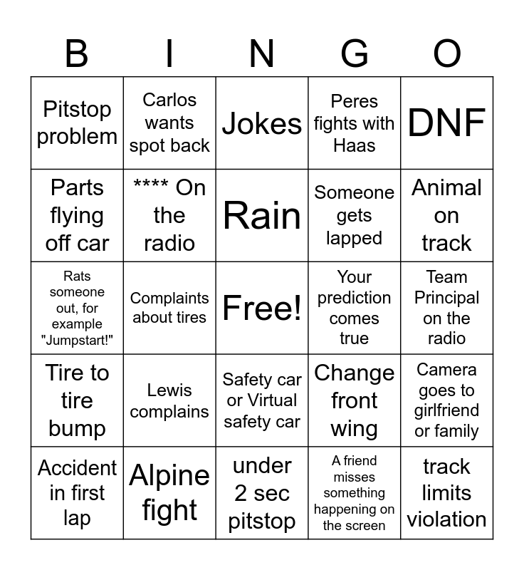 This bingo card has a free space and 24 words: Lewis complains, Alpine fight, Rain, Accident in first lap, DNF, Pitstop problem, Parts flying off car, Carlos wants spot back, Your prediction comes true, Safety car or Virtual safety car, Someone gets lapped, Rats someone out, for example "Jumpstart!", Change front wing, Camera goes to girlfriend or family, **** On the radio, A friend misses something happening on the screen, Team Principal on the radio, Jokes, Animal on track, Complaints about tires, track limits violation, Tire to tire bump, Peres fights with Haas and under 2 sec pitstop.