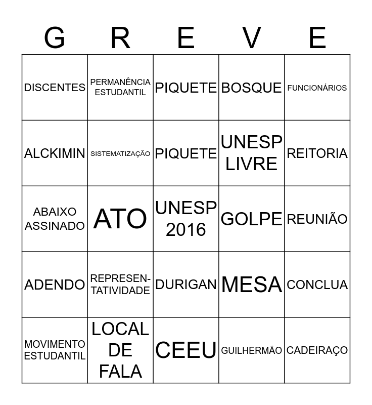 This bingo card has a free space and 24 words: REPRESEN-TATIVIDADE, LOCAL DE FALA, PIQUETE, MOVIMENTO ESTUDANTIL, FUNCIONÁRIOS, DISCENTES, ALCKIMIN, PERMANÊNCIA ESTUDANTIL, GOLPE, DURIGAN, UNESP LIVRE, ABAIXO ASSINADO, MESA, CONCLUA, SISTEMATIZAÇÃO, GUILHERMÃO, REUNIÃO, PIQUETE, REITORIA, ATO, CADEIRAÇO, ADENDO, BOSQUE and CEEU.