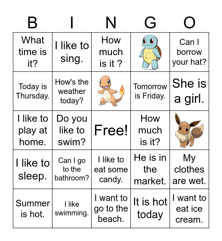 This bingo card has 3 images, a free space and 21 words: Can I go to the bathroom?, I like swimming., Summer is hot., Can I borrow your hat?, What time is it?, Today is Thursday., I like to sing., How much is it?, I like to eat some candy., Tomorrow is Friday., I like to play at home., He is in the market., My clothes are wet., How's the weather today?, It is hot today, How much is it ?, She is a girl., Do you like to swim?, I want to eat ice cream., I like to sleep. and I want to go to the beach..