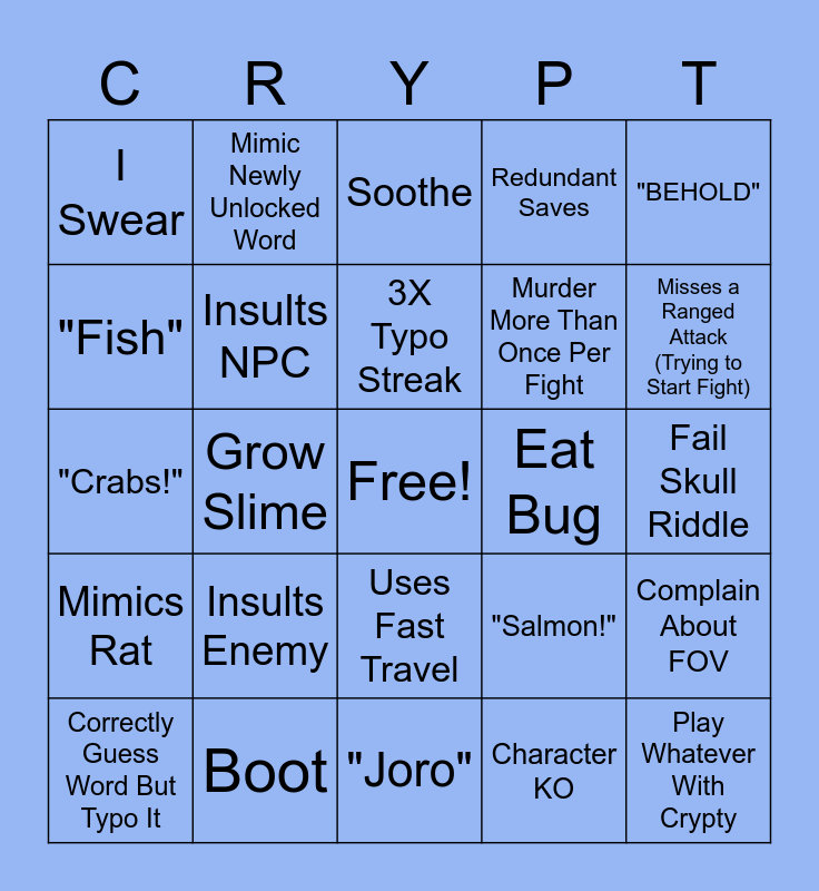 This bingo card has a free space and 31 words: "Joro", Typo Zap, Grow Slime, Blocked Letter, I Swear, Soothe, Insults NPC, "Salmon!", Eat Bug, Character KO, Fail Skull Riddle, Play Whatever With Crypty, Typo Serenade, Touting Own Intelligence, Misses a Ranged Attack (Trying to Start Fight), Complain About Hand in Whatever, Complain About FOV, Insults Enemy, Mimics Rat, Uses Fast Travel, "BEHOLD", Fail to Break Armour (No Damage), Correctly Guess Word But Typo It, Mimic Newly Unlocked Word, Murder More Than Once Per Fight, "Fish", Redundant Saves, "Crabs!", Boot, 3X Typo Streak and Crypty Tells Me to Stop Repeating Myself.